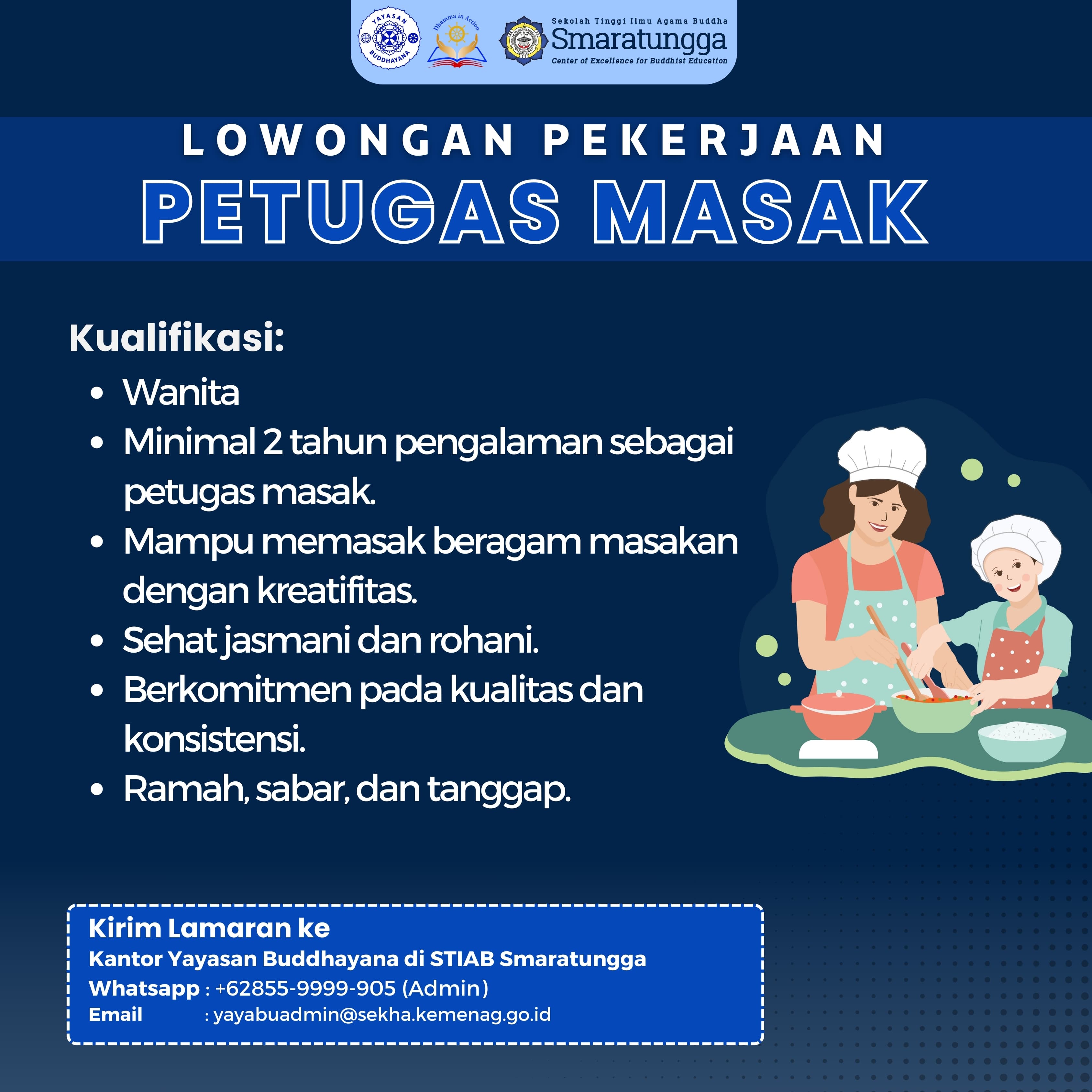 Jika kamu tertarik dan memenuhi kualifikasi tersebut, Kirim lamaran pekerjaanmu ke Kantor Yayasan Buddhayana di STIAB Smaratungga